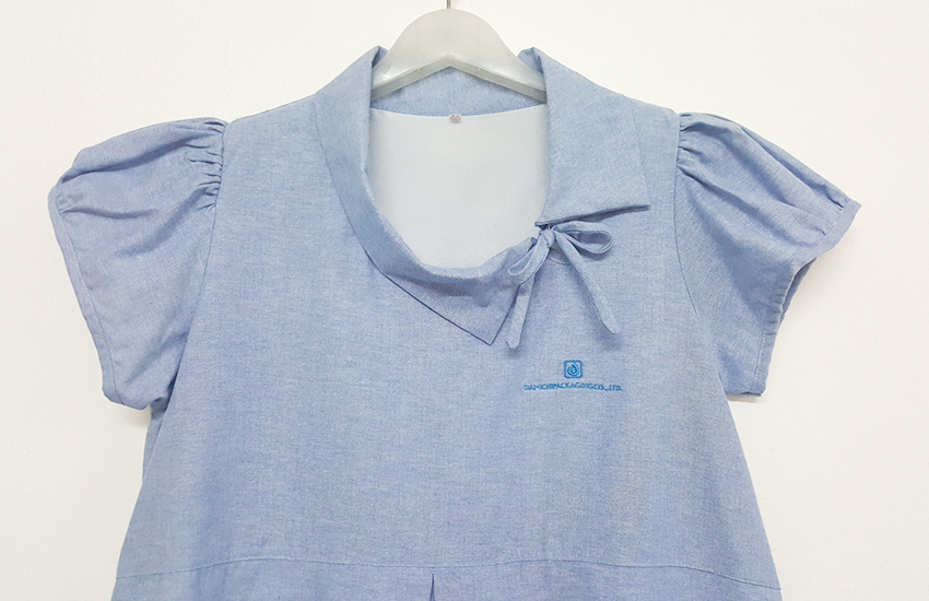 ชุดคลุมท้องปกตลบ คอผูก สีฟ้า งานปักโลโก้บริษัท